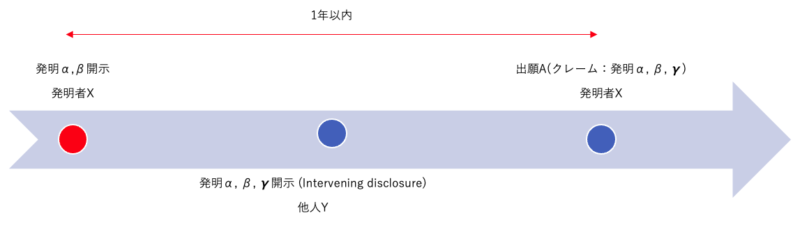先開示に記載されていない内容がintervening disclosureに開示されている場合は、intervening disclosureに記載の当該内容は先行技術になります(例外適用はありません)。例えば下図のように、先開示が発明α、βを開示していれば、Intervening disclosureにてα、βに関しては例外適用があります。しかし、Intervening disclosureに開示された発明γについては、例外規定の適用は受けられません。