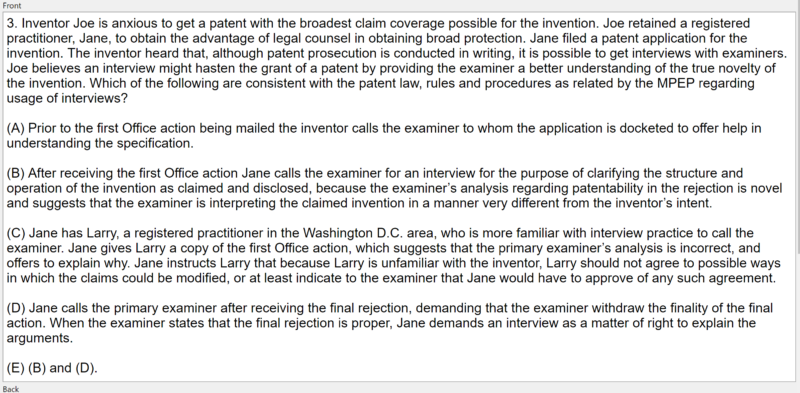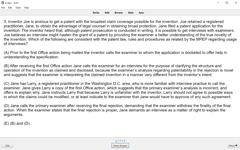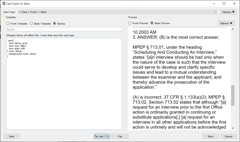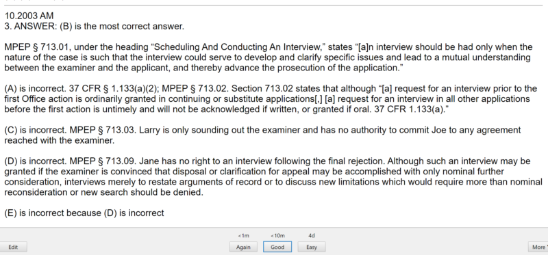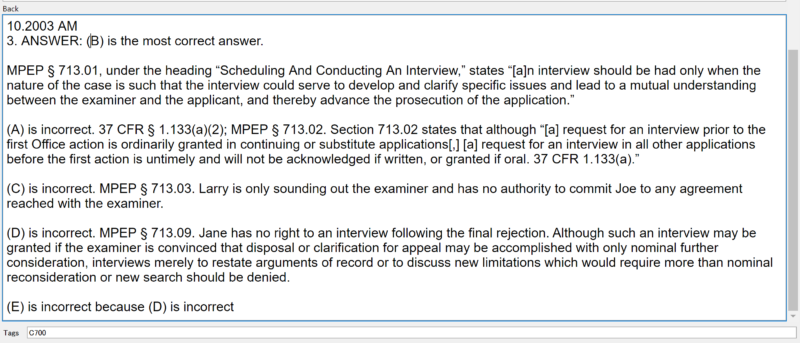 また、ひとつのコツですが、Ankiwebでは各カードにTagをつけることができます。ここではC700として、この問題がMPEPのChapter700関連の問題であることを示しています。Chapter毎に整理しておくと、後々Chapter毎のMPEPの確認、同種の問題の整理の点で効果的です。条文・キーワード等をタグとして使うのも手です(例えば102(a), 103, 112、Interview, Declaration等)