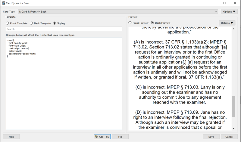 Patent Agent試験用には、最もベーシックなBasicタイプのカードを作成します。このタイプのカードだと、ほぼ本番と同じ形式で問題を表示可能です。Basicタイプは、Frontが表示されて、クリック(又はタップ)するとBackが表示される形式のカードです。AnkiwebではBasicタイプのカードの他、Basic (and reverse)という、裏を問題にして表を答えさせるタイプのカードもありますが、Patent Agent試験(特に過去問)ではこれは使わないです。