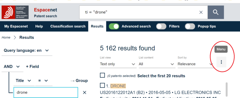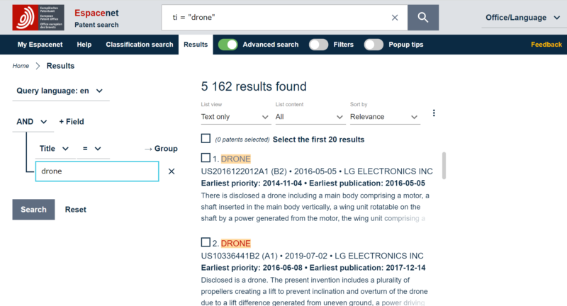 Espasnetでの特許の検索は検索フィールドにキーワード、特許分類等を入力することで行います。例えばタイトルに”drone”を含むものを検索する場合は、以下のように