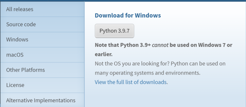 上記のURLからpython公式サイトにアクセスし、Downloadsタブから最新版のPythonパッケージをダウンロードします(下図では現時点の最新版(Python3.9.7)のダウンロードリンクが表示されています)。exe形式のファイルをダウンロードされたら、exeファイルをクリックしてインストールに進みます。