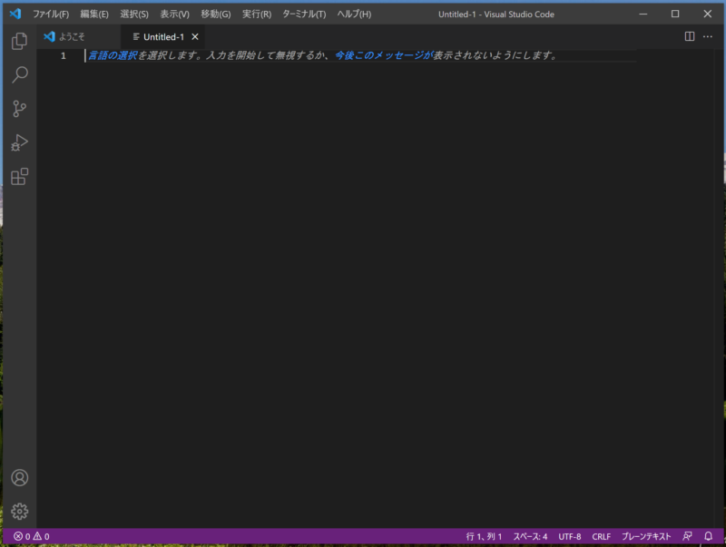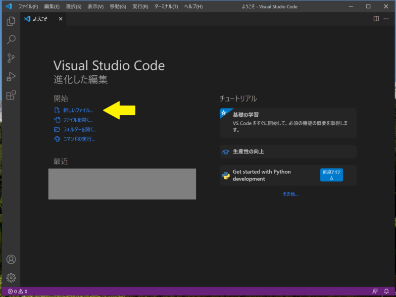 まずはVisual Studio Codeを開きます。以下の初期画面にて「新しいファイル」を選択します。