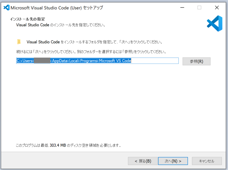 次に、以下のインストールフォルダの指定画面に移ります。デフォルトのままでよいです。このまま「次へ」をクリックして下さい。