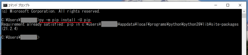 以下はコマンドプロンプトでの入力の様子を示しています。ここではアップデートが不要だったため、Requrement already satisfiedと表示されています。