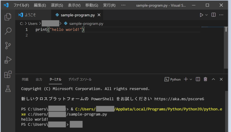Pythonとエディタ(Visual Studio Code)のインストールが完了したら、一度動作テストをしてみましょう。Pythonのサンプルプログラムが動作するか検証します。