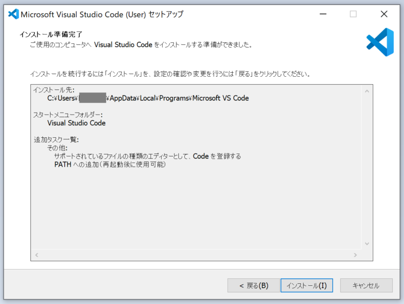 以下のインストール準備完了画面にて、「インストール」をクリックすると、インストールが始まります。