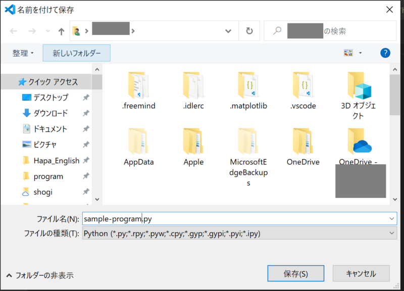 入力が完了したら、ファイルを保存します。「ファイル」→「名前をつけて保存」と進んで下さい。ファイル名は任意で構いません(以下ではsample-program.py)。ファイル名を決めたら保存をクリックして下さい。