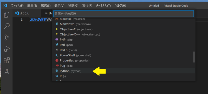 言語の選択をクリックすると、以下のプログラミング言語リストが表示されます。この中のPythonを選択します。
