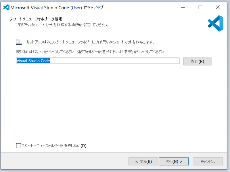 続いて以下のスタートメニューフォルダーの指定です。ここも「次へ」をクリックして下さい。